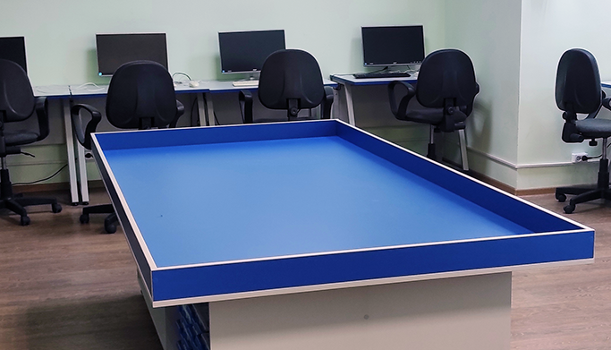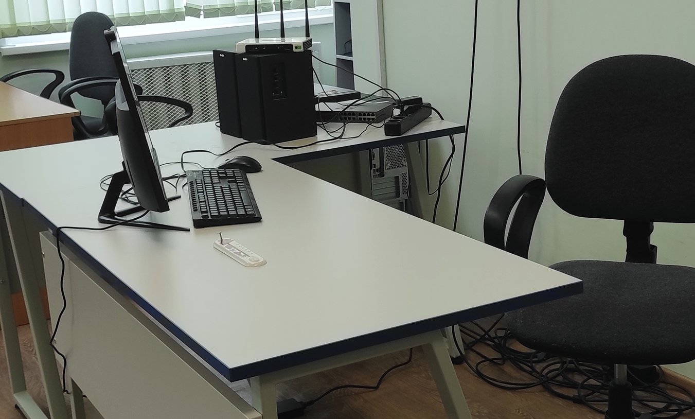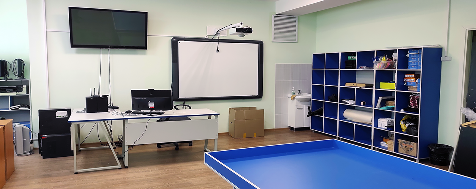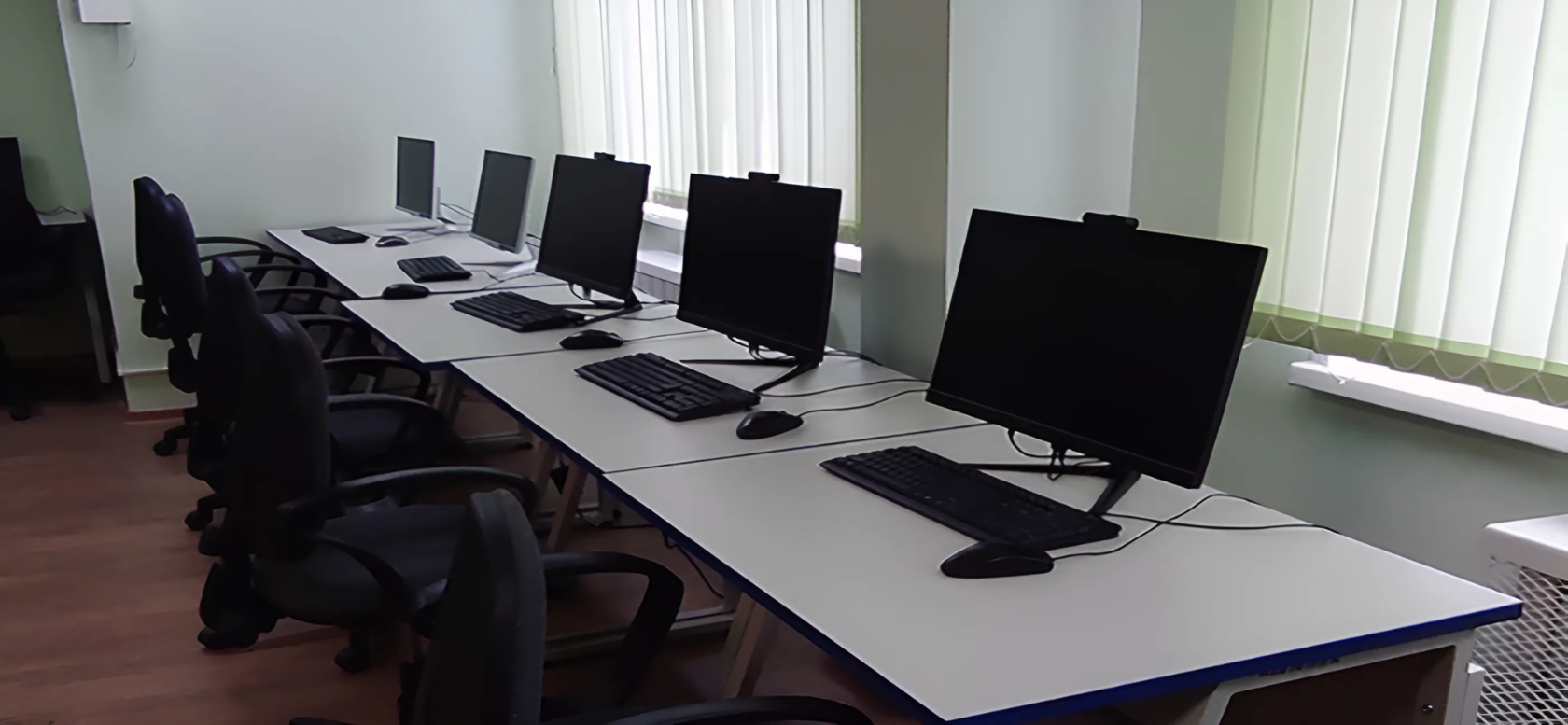 в компьютерный класс поставили новые шкафы, стол для занятий и проведения соревнований по робототехнике и ученические столы серии "Трапеция" от фабрики "Омега";