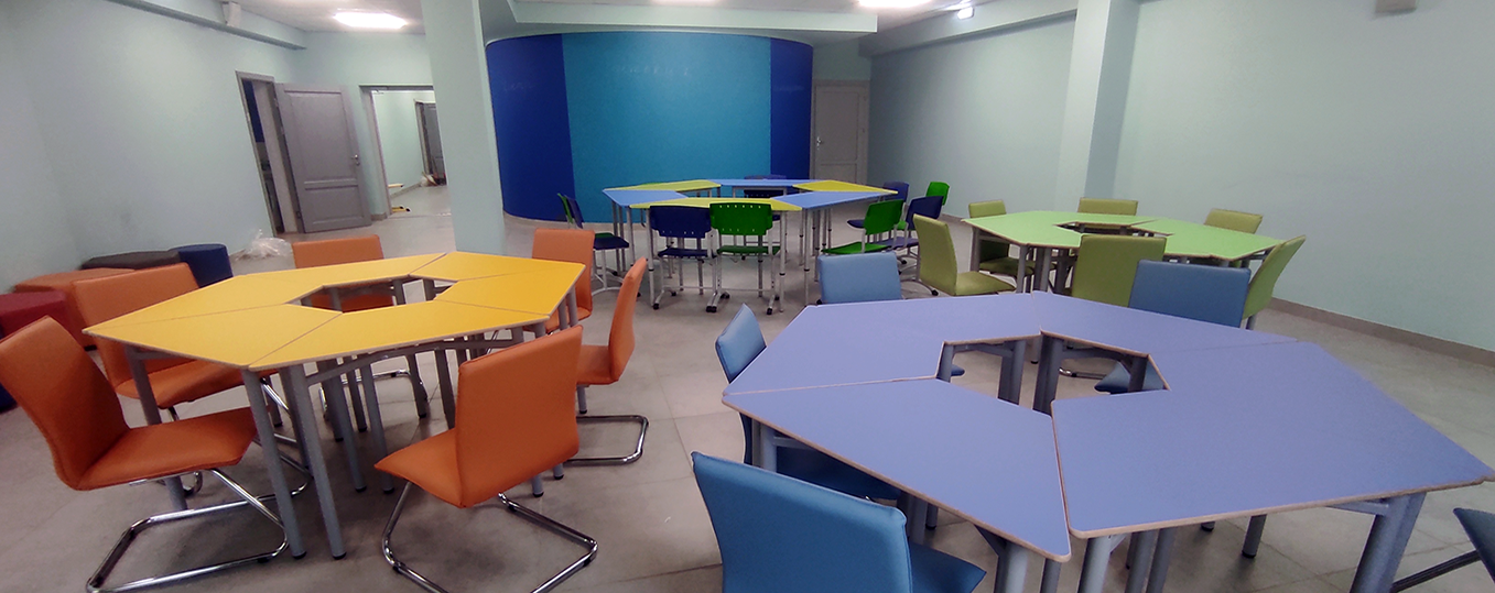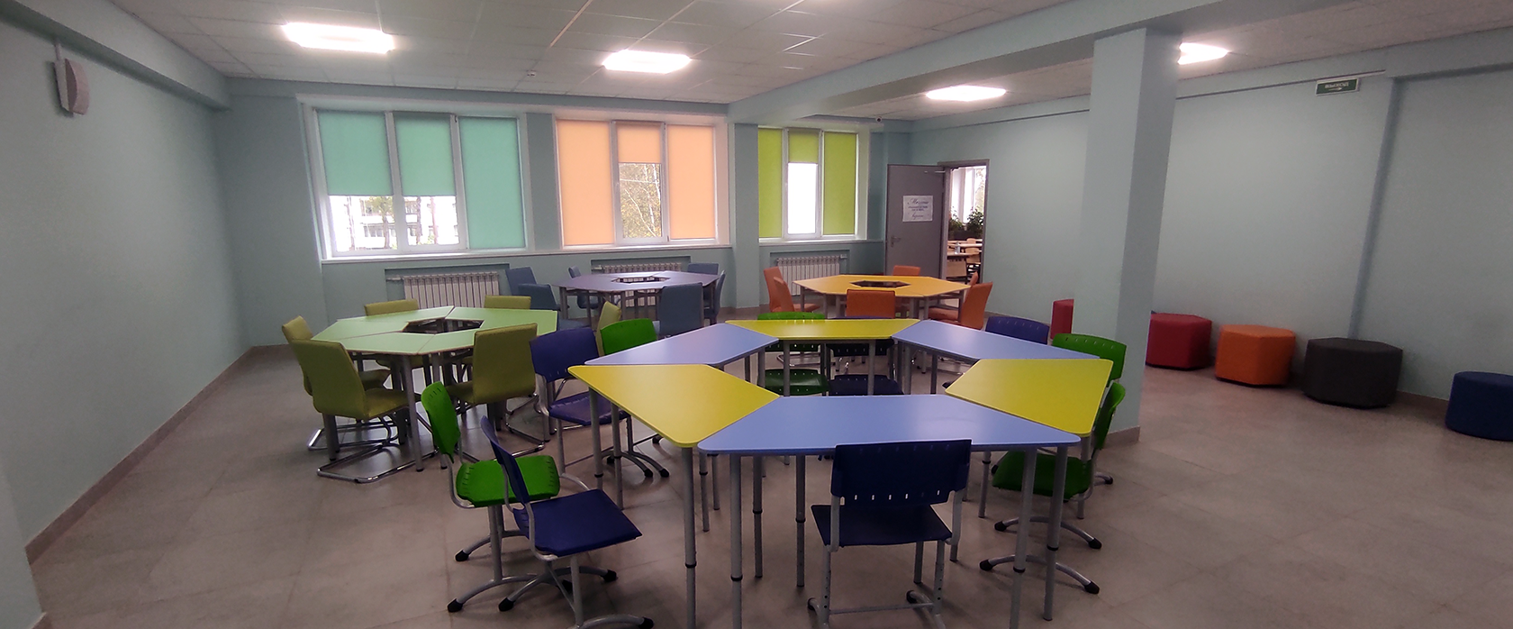 поставлена ученическая и лабораторная мебель, сисетмы хранения, мебель в библиотеку и рекреации;